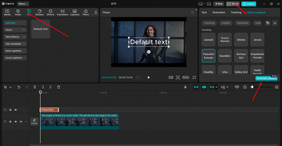 After importing the video, click on the “Text” button at the top and type or paste the text that you want the AI to read. Then, select the “Text to speech” option. Choose from the available voices and adjust the settings such as speed and pitch to match the tone of your video. CapCut’s AI will instantly generate a voiceover for you.